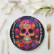 Overall, this round paper plate beautifully captures the essence of Día de Muertos with its vibrant colours, intricate artwork, and thoughtful design. It serves as a fitting tribute to celebrate the memories of loved ones.