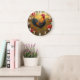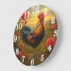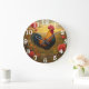 Sunset farmhouse clock featuring a colourful rooster perched on wood, surrounded by red roses under golden twilight. White numerals on warm-toned backdrop create rustic charm—perfect for kitchen decor or farm lover gifts.