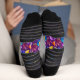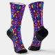 Vibrant socks with a kaleidoscope design feature bold purple, blue, yellow, and orange patterns. Black heels and toes add contrast, creating a lively, energetic vibe.