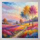 An enchanting landscape painting bursting with the joyful colours of spring. Rolling hills are adorned with a tapestry of blooming wildflowers in shades of fuchsia, lavender, gold, and cerulean. A gentle path winds through the vibrant flora, leading the eye towards a line of graceful trees with foliage painted in brilliant hues of yellow, blue, and pink. The sky above is a spectacle of soft pastels, with wisps of clouds bathed in the warm glow of dawn or dusk, creating a serene yet lively atmosphere. This artwork captures the essence of a dreamlike springtime, inviting viewers to immerse themselves in its beauty and tranquillity.