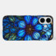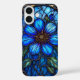 Vibrant stained glass window depicting a large blue flower with intricate details, surrounded by green leaves and buds. The background features blue hues and geometric patterns, enhancing the overall elegance of the artwork.
