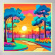 A captivating illustration of a vibrant cityscape bathed in the warm glow of a setting sun, framed by lush greenery and a winding path (This Design Made With AI). Place Order Today and Embrace the Joy of Shopping!