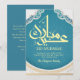 This card features a stunning turquoise blue background with traditional Islamic geometric motifs. The white and gold frame provides a modern and fresh look for your holiday greetings.