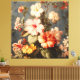 A lush bouquet of colourful flowers is displayed against a muted background. The detailed petals and leaves create a sense of depth and richness.