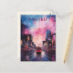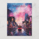 A stunning modern postcard illustration of downtown Nashville, USA, featuring a nostalgic red streetcar moving along illuminated city streets at sunset. the sky is painted with dramatic shades of pink, blue, and purple, blending seamlessly in a watercolor-inspired style. Neon-lit buildings, street signs, and bustling city life create an atmospheric and lively urban scene, capturing the essence of music city’s vibrant nightlife.