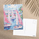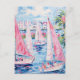 This vibrant watercolor postcard captures the joyous spirit of a coastal getaway, featuring picturesque pink sailboats gliding across shimmering blue waters, framed by charming pastel cottages and lush palm trees. It's an instant mini-vacation in an envelope! Send a splash of colourful paradise to someone special!