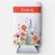 This vibrant watercolor wildflowers personalized can cooler showcases a pattern with lively mix of purple, orange, and red jewel-toned blooms, paired with sleek modern script typography.