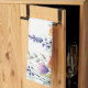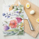 This vibrant watercolor wildflowers personalized kitchen towel showcases a pattern with lively mix of purple, orange, and red jewel-toned blooms, paired with sleek modern script typography.