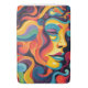 Vivid swirls and curls in a rainbow of colours create the abstract profile of a man or woman with a peaceful expression. Shades of blue, orange, yellow, and red blend harmoniously to outlines facial features and flowing hair.