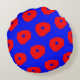 This round pillow features an illustration of red flakes on an electric blue background.