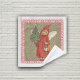 This wash cloth is white with a Victorian angel dressed in a hooded red cape holding a small Christmas tree and presents on a tan background with falling snow in an ornate red border.