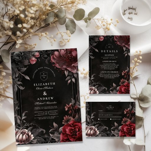 Featuring intricate floral designs, flowing lines, and dark, romantic accents, this card helps ensure your guests have all the information they need while staying true to your enchanting celebration’s theme.