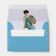 This invitation sized envelope is a pretty blue with a Victorian artist woman wearing a blue and white plaid painter's smock holding a wooden artist paint pallette covered in paints in one hand and a paint brush in the other hand on a light blue background on the inside of the envelope. customise your return address on the front with the template.