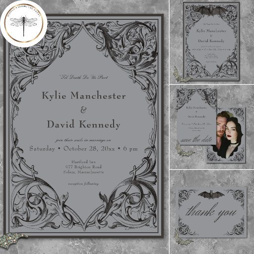 Victorian Bat Until Death Black & Grey Wedding Invitation
