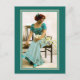 A beautiful young lady in green or turquoise sitting on a bench, with flowers on her lap, typical early art nouveau.