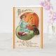 A Victorian Boy is carving a huge jack-o-lantern while his black cat is sitting nearby. Image of a Vintage Postcard on vivid orange background.