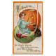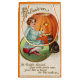 A Victorian Boy is carving a huge jack-o-lantern while his black cat is sitting nearby. Image of a Vintage Postcard on vivid orange background.