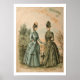 Delightful vintage fashion illustration of two ladies in the mid to late 1800s wearing gorgeous bustle dresses. The bustle dresses are in green and blue with beautiful accents. This poster would look wonderful framed and even better in a framed set of 2 – 4 illustrations.