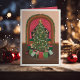 Original illustration of victorian christmas tree decorated with real candles; arched window with snow. Optional Photo and personal message area inside.