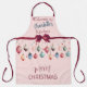 This pretty kitchen apron features lots of multicolored Victorian Christmas ornaments hanging down from the waistline. They are various shades of blue, yellow and pink. The bib of the apron is personalised by adding your name with the easy to use template provided. The bottom of the apron says Merry Christmas. A faux cranberry bow separates the sections of the apron and the ties and neck ribbon match the bow. This would be a beautiful apron to wear while preparing your meal and entertaining guests at your holiday party.
