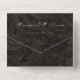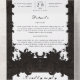 All in one tri- fold wedding invitation featuring a dark brown Victorian design with ornamental flowers. Wedding invitation, rsvp card with meal choices, details and envelope combination.