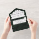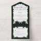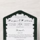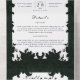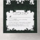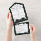 All in one tri- fold wedding invitation featuring a dark green Victorian design with ornamental flowers. Wedding invitation, rsvp card with meal choices, details and envelope combination.