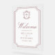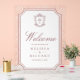 Elegant catholic wedding welcome sign featuring beautiful victorian crest with intricate details.
