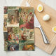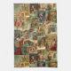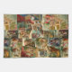Jewel-toned festive vintage holiday collage seamless pattern featuring scenes of jolly Father Christmas bringing gifts to pretty Victorian children.