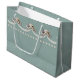 This bag has the Victorian style and a textured green background. Ribbons are draped across the top with highlights of Christmas tapestry. A row of pearls add to the decor. If you like the vintage look of yesteryear-year, you may love this design for this year’s holidays.