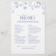 Introducing our stunning French Blue & White Victorian Bridal Shower Game! This game "what's on your phone" is the perfect addition to your upcoming bridal shower. It features a refreshing mix of traditional and modern style, with classic hand drawn blue Victorian florals of garden flowers, bees, and butterflies on one side. Plus, you can customize it with your own bridal details in modern hand lettered calligraphy to make it truly unique. And as a special added touch, turn it around to find a coordinating blue texture on the back adding even more detail. Don’t hesitate - this one-of-a-kind game will make your event one everyone will remember! View suite here: https://www.zazzle.com/collections/french_blue_white_victorian_floral_bridal_shower-119265327422133417 Contact designer for matching products. Copyright Surridge Design Co. for Elegant Invites, all rights reserved.