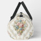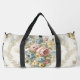 This image showcases a duffel bag featuring a rich and intricate floral tapestry pattern, reminiscent of lush Victorian gardens and antique textiles. The central design presents an abundant bouquet of blossoms in soft pinks, dusty blues, and muted yellows, intertwined with diverse green foliage. The background is a textured, light cream or off-white, subtly adorned with faint, elegant scrolling patterns that frame the vibrant floral centerpiece. Equipped with sturdy, dark-coloured straps and a secure zipper closure, this bag is a functional yet exquisitely designed accessory, perfect for travel, gym use, or adding a sophisticated, old-world charm to any ensemble.