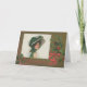 This vintage Victorian era Christmas card design features a beautiful woman in a white dress with a matching bonnet tied with a green bow. She is surrounded by holly branches.