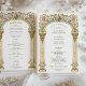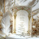 This elegant Victorian wedding program features a grand gold arch adorned with climbing vines of pink roses and delicate greenery. The intricate floral details and classic column design exude timeless sophistication and romantic charm. Perfect for couples seeking vintage-inspired wedding stationery with a luxurious aesthetic and a touch of floral elegance.