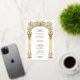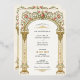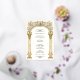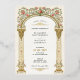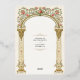 This elegant Victorian wedding invitation features a grand gold arch adorned with climbing vines of pink roses and delicate greenery. The intricate floral details and classic column design exude timeless sophistication and romantic charm. Perfect for couples seeking vintage-inspired wedding stationery with a luxurious aesthetic and a touch of floral elegance.