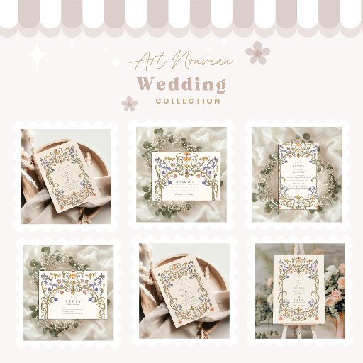 A refined and graceful wedding design with an ornate Victorian-style frame, delicate floral accents, and elegant scrollwork in soft hues of lavender, gold, and coral. Ideal for a romantic and timeless celebration with vintage sophistication.