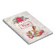 Christmas holiday themed journal. The background is a faded vintage collage with roses, leaves and french script. On top are pretty flowers including - poinsettia, roses, and peonies surrounding an antique victorian rocking horse.