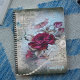 Lovely, vintage, red rose florals on newspaper print, featuring a faux pearl brooch and necklace, birdcage with teal bow to create a luxury, extravagant, shabby chic style for planning.