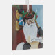 Victorian Santa Clause checking his naughty or nice list. a red top hat with goggles and bag of toys in a backdrop of blue