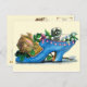 Cute vintage illustration of a blue Victorian slipper with pink ribbon accents. A little puppy and Lily of the Valley flowers are nestled comfortably inside the shoe, and a single rose rests on the front.