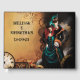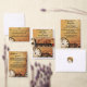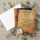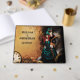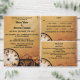 A warm orange-brown backdrop sets the tone for this steampunk wedding design, featuring a vintage clock, gears, and brown line art. At the centre, a Victorian couple—dressed in their finest steampunk attire