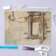 This Steampunk design features a blueprint of a sewing machine with a person's hand making measurements above and other measuring motifs in the background.