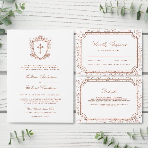Victorian Terracotta Floral Line Art Wedding RSVP Card