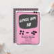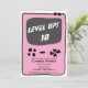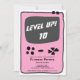 A fun, playful kids birthday party , perfect for video game and console player with a cute carton of a video game in editable pink and grey colour and square pixels pattern at the back.
