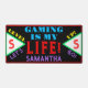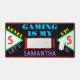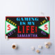 Fun kids video gamer Name in light purple typography. Geometric pattern with Monogram initial in red on both sides inside bright green and white triangles. Gaming is my life written in light blue and red font. Level up let's go written in yellow and purple colours. Black background with red trim. Original Design by TamiraZDesigns.