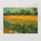 View of Arles with Irises in the Foreground by Vincent van Gogh is a vintage fine art post impressionism landscape nature painting. A wheat field with purple iris flowers in the foreground on a farm. Trees and the town of Arles with houses are in the background.