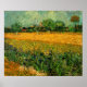 View of Arles with Irises in the Foreground by Vincent van Gogh is a vintage fine art post impressionism landscape nature painting. A wheat field with purple iris flowers in the foreground on a farm. Trees and the town of Arles with houses are in the background.