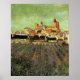 View of Saintes-Maries by Vincent van Gogh is a vintage fine art post impressionism architectural painting featuring a landscape with fields in the foreground and the city of Saintes Maries in the background with the cathedral in the centre of town.