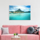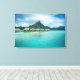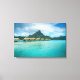 Canvas landscape print of a luxury overwater thatched roof bungalow resort in a vacation resort in the clear blue lagoon with a view on the tropical island of Bora Bora, near Tahiti, in French Polynesia.