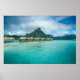 Poster print of a luxury overwater thatched roof bungalow resort in a vacation resort in the clear blue lagoon with a view on the tropical island of Bora Bora, near Tahiti, in French Polynesia.