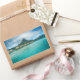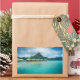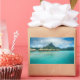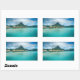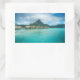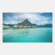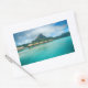 Rectangular souvenir photo sticker of a luxury overwater thatched roof bungalow resort in a vacation resort in the clear blue lagoon with a view on the tropical island of Bora Bora, near Tahiti, in French Polynesia.
